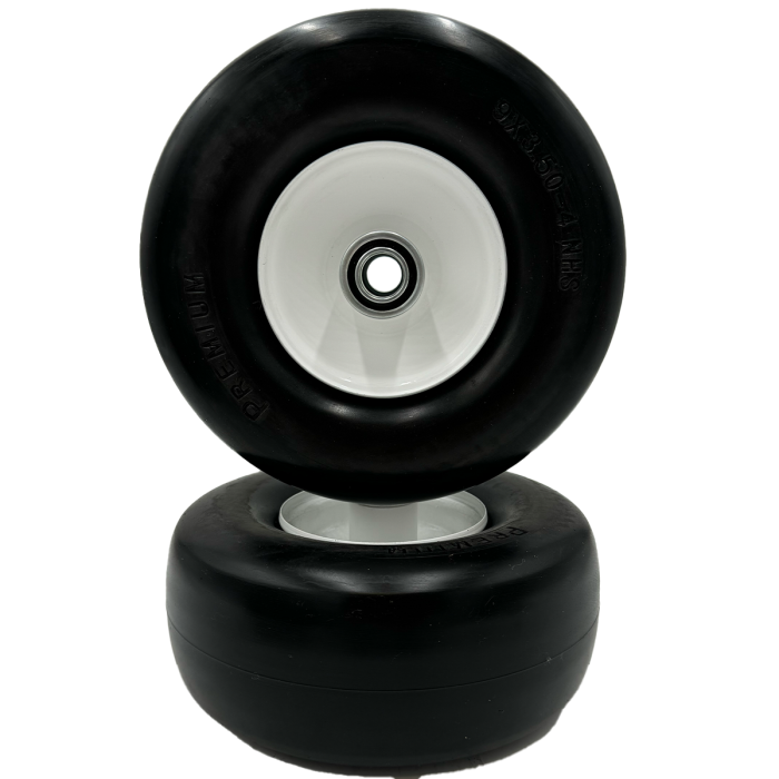 Description / Set of 2 - 9x3.50-4 Flat Free Smooth Lawn Mower Wheel, 4.0" Centered Hub, 3/4" Bearings